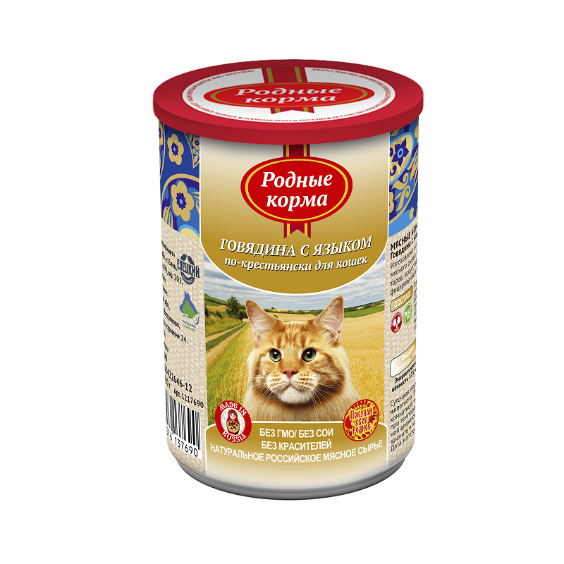 Говядина с языком по-крестьянски – это повседневный влажный консервированный корм для взрослых кошек от российского бренда «Родные корма»1.