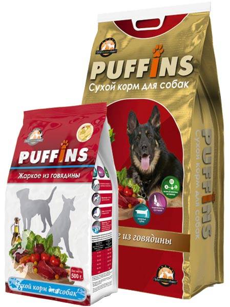 Жаркое из говядины (Puffins) – это полнорационный сухой корм для взрослых (1-6 лет) и пожилых (от 7 лет) собак всех пород.