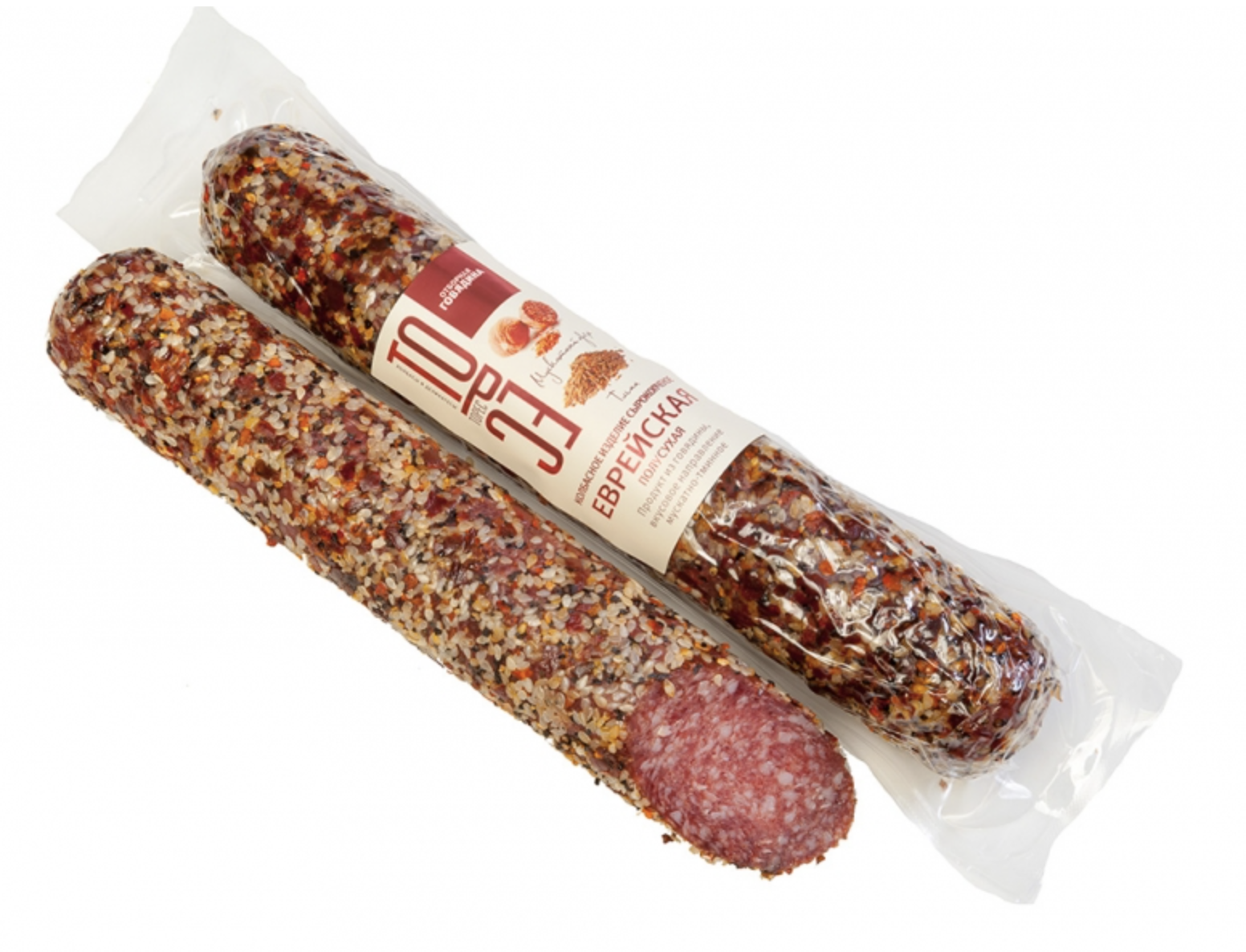 Колбаса Еврейская ГОСТ в обсыпке из специй (Торес) – это сырокопченое колбасное изделие, готовое к употреблению.