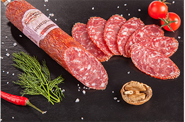 Колбаса «Немецкая» – это сырокопченое колбасное изделие, которое изготавливается АО «Шувалово»