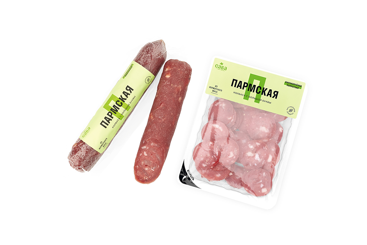 Колбаса сырокопченая полусухая «Пармская» под брендом «САВА» выпускается цельным куском и в виде сервировочной нарезки.