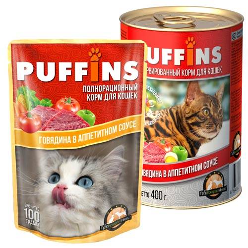 Кусочки мяса в соусе со вкусом говядины (Puffins) – это полнорационный влажный консервированный корм для взрослых (1-6 лет) и пожилых (от 7 лет) кошек всех пород.