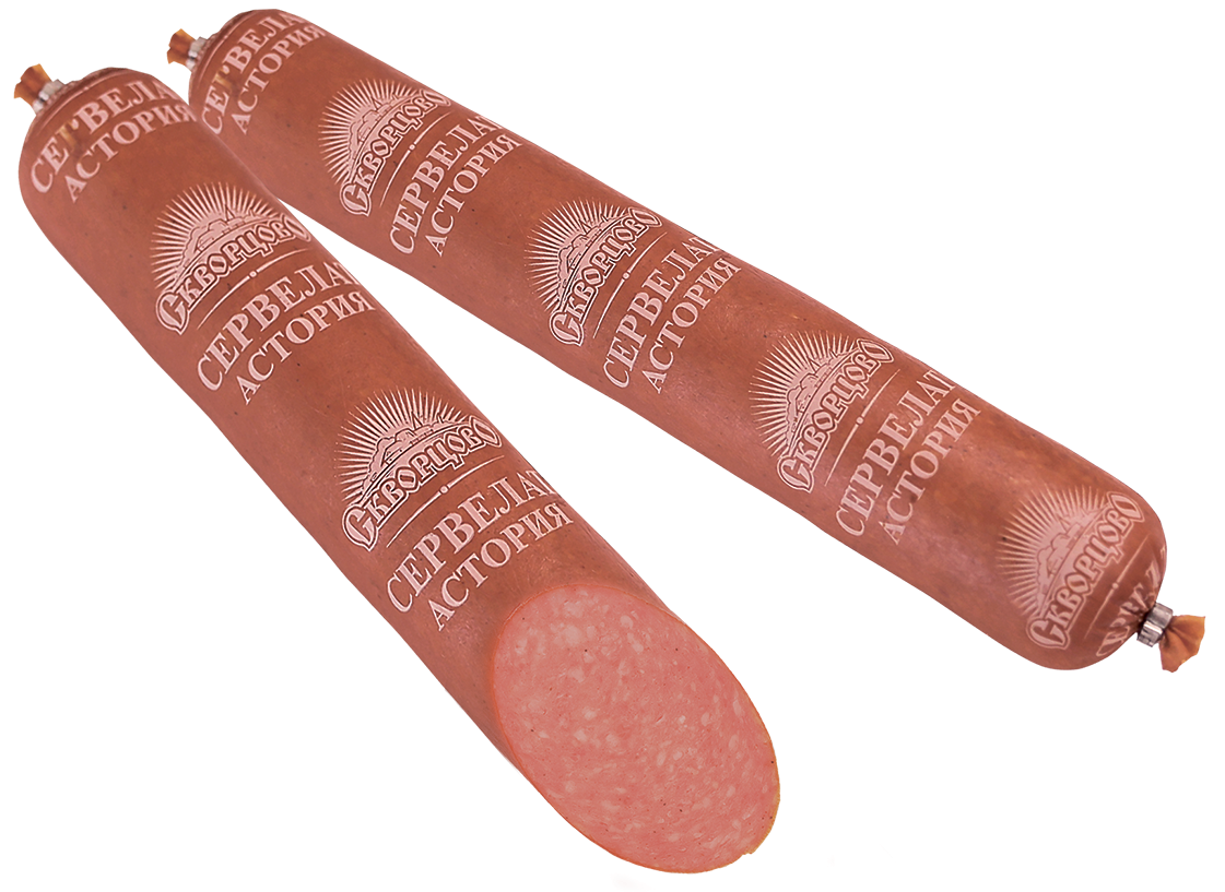 Полукопченая колбаса «Сервелат Астория» (Скворцово) – колбасное изделие из мяса птицы и шпика. Готово к употреблению.1