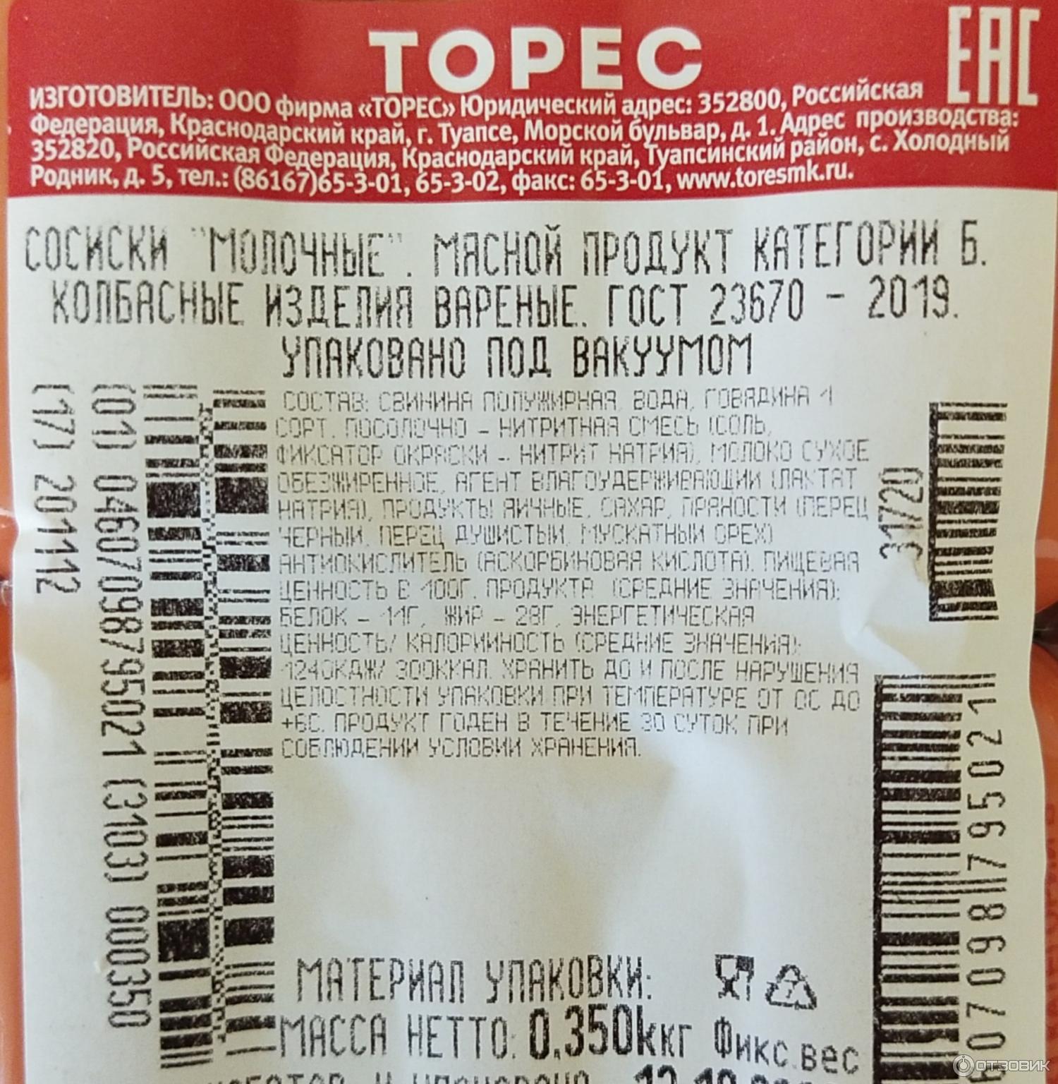 Сосиски Молочные ГОСТ (Торес) – это вареное колбасное изделие, готовое к употреблению.