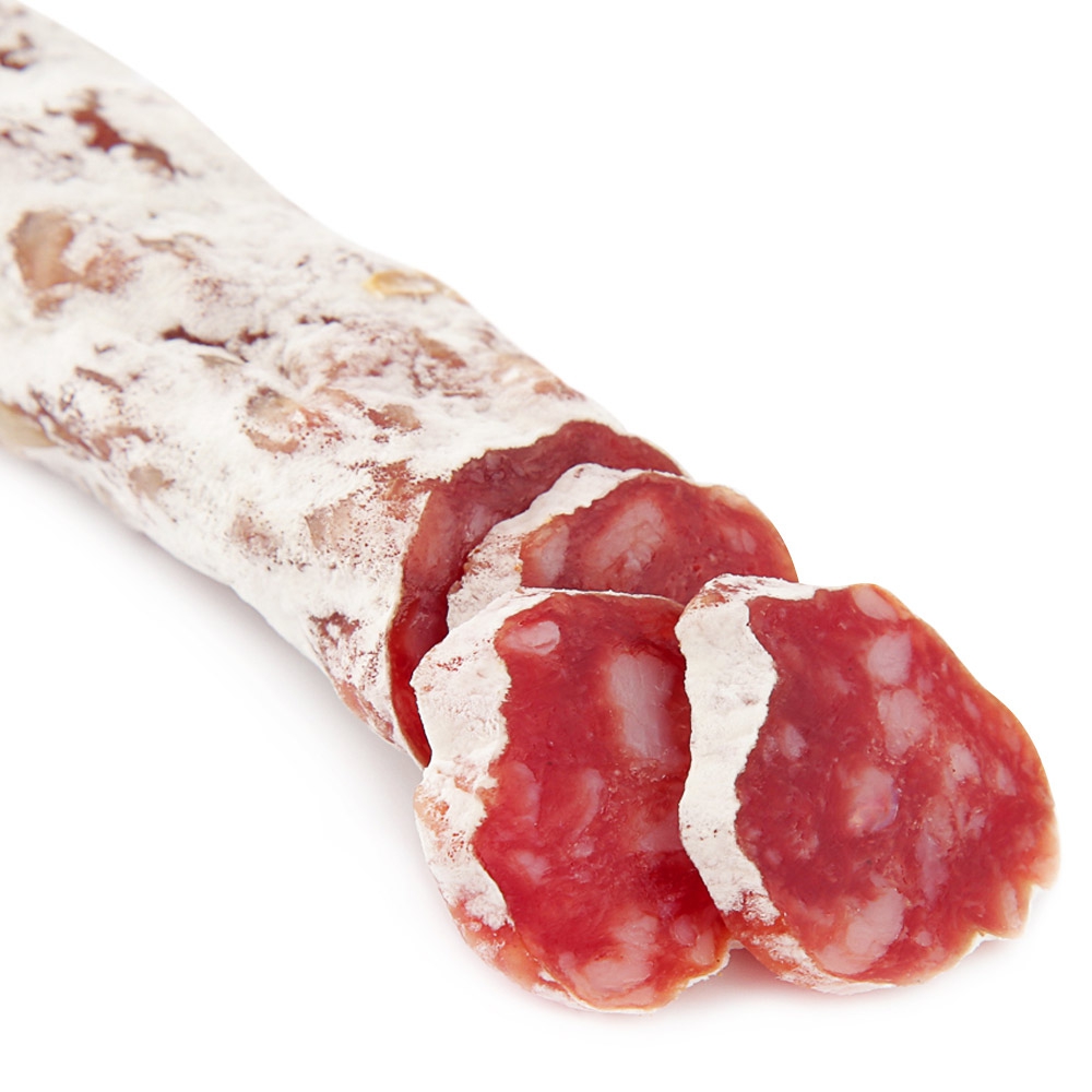 Для ее изготовления используют свинину высшего сорта и натуральные специи. Благодаря этому продукт приобретает плотную консистенцию и яркий винный цвет с вкраплениями жира. Благородная белая плесень свидетельствует о том, что колбаса созрела, и придает ей характерный грибной аромат.
