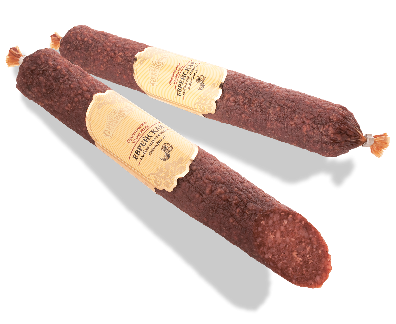 Сырокопченая колбаса «Еврейская» (Скворцово) – сырокопченое колбасное изделие из говядины со специями. Готово к употреблению.1