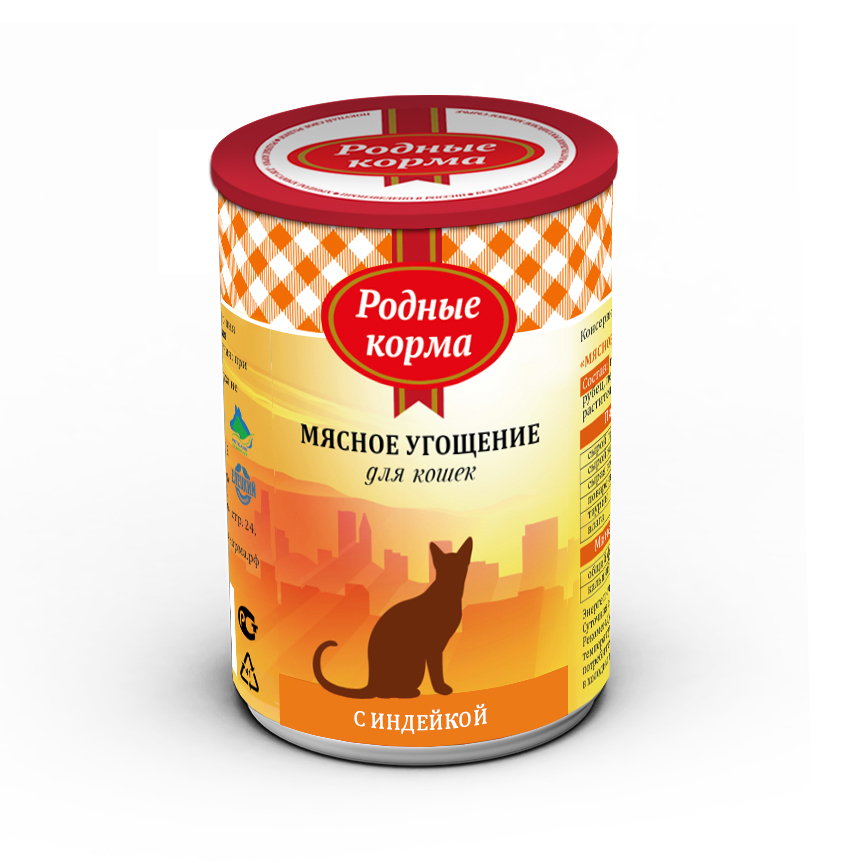 Мясное угощение с индейкой – это повседневный влажный консервированный корм для взрослых кошек от российского бренда «Родные корма»1.