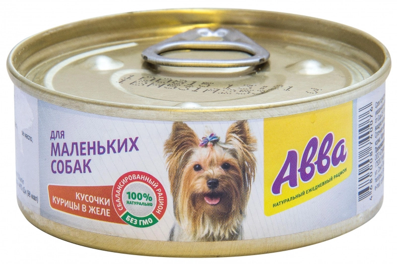 С кусочками курицы в желе – консервы для взрослых собак мелких пород от бренда «ABBA».