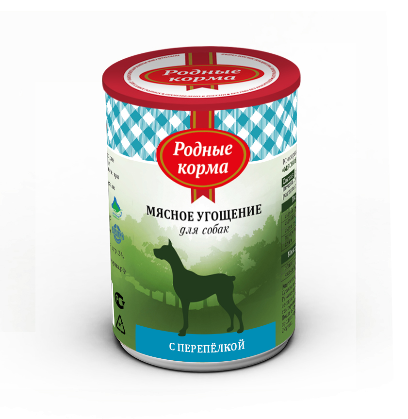 Мясное угощение с перепелкой – это мелкокусковой консервированный корм для собак любых пород (от 1 года) от бренда Родные корма. Соответствует ТУ 9216-008-00422646-12