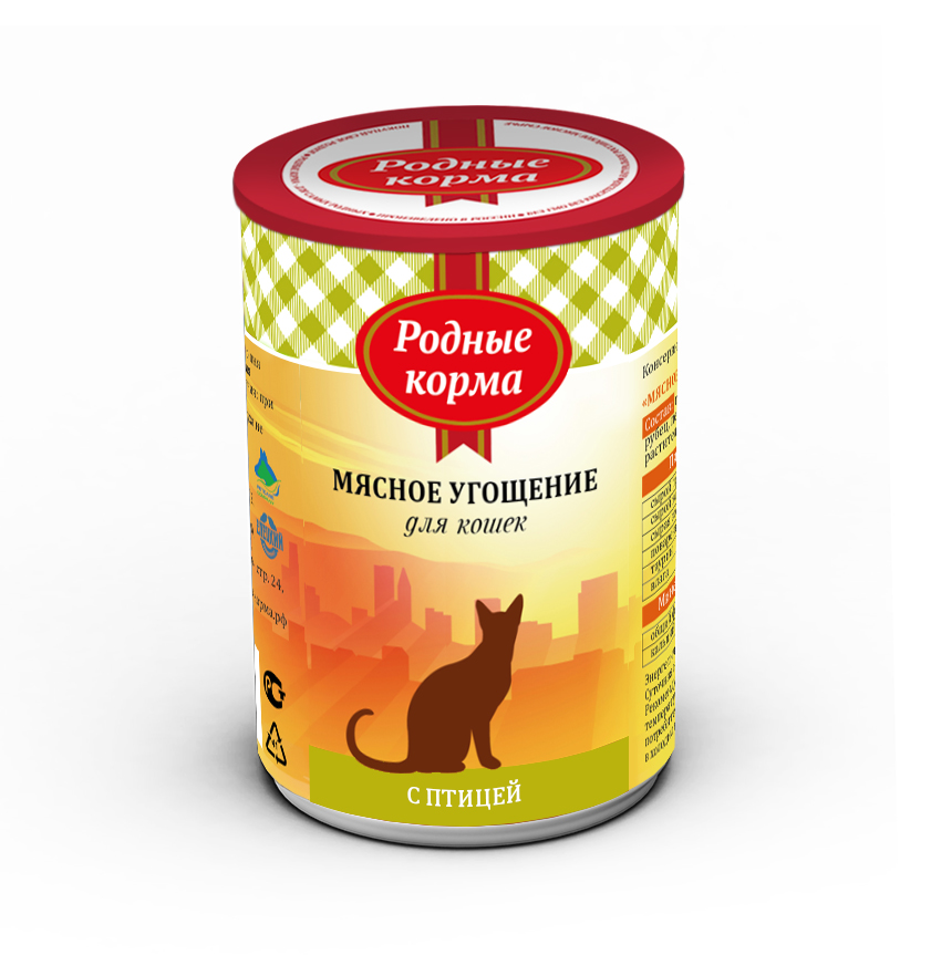 Мясное угощение с птицей – это повседневный влажный консервированный корм для взрослых кошек от российского бренда «Родные корма»1.