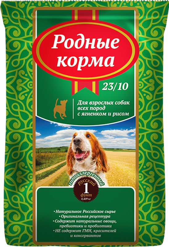22/10 С ягненком и рисом для собак – это сухой сбалансированный корм для взрослых собак любых пород от бренда Родные корма. Соответствует ГОСТ Р 55453-2013.