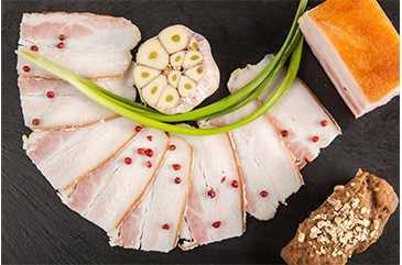 Поверхность чистая с наличием молотого черного перца, чеснока. Консистенция плотная. Шпик без пожелтений, с наличием прослоек мышечной ткани.