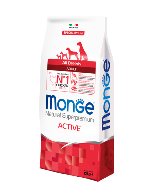 All Breeds Adult Active с курицей (Monge) – сухой корм класса супер-премиум для взрослых собак всех пород с высокой активностью и особыми потребностями.