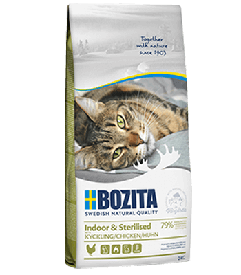 Indoor and Sterilised – это сухой кор от торговой марки Bozitaм со вкусом курицы для взрослых и растущих кошек, ведущих малоподвижный образ жизни, а также стерилизованных кошек.