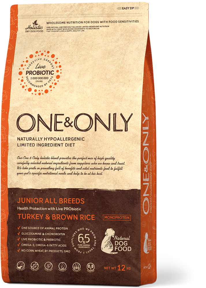 Junior All Breeds Turkey with Brown Rice (One and Only) – это полнорационный сухой корм для щенков всех пород в возрасте от четырёх месяцев до года.