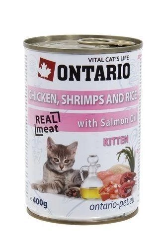 Kitten Chicken, Shrimps and Rice Salmon with Oil – влажный консервированный корм от чешского бренда Ontario для котят.