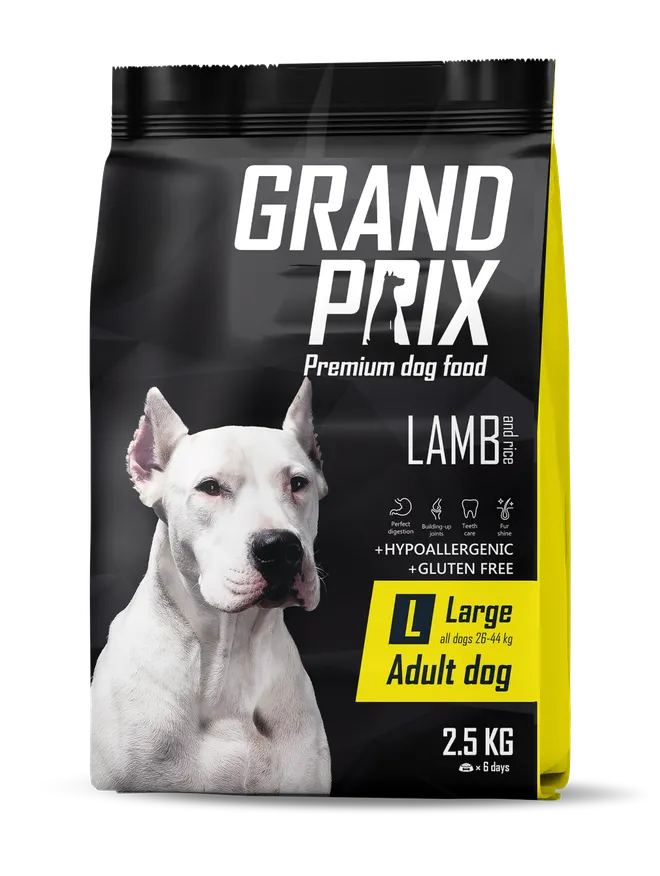 Large Adult ягненок – полнорационный сухой корм торговой марки Grand Prix для собак крупных пород.