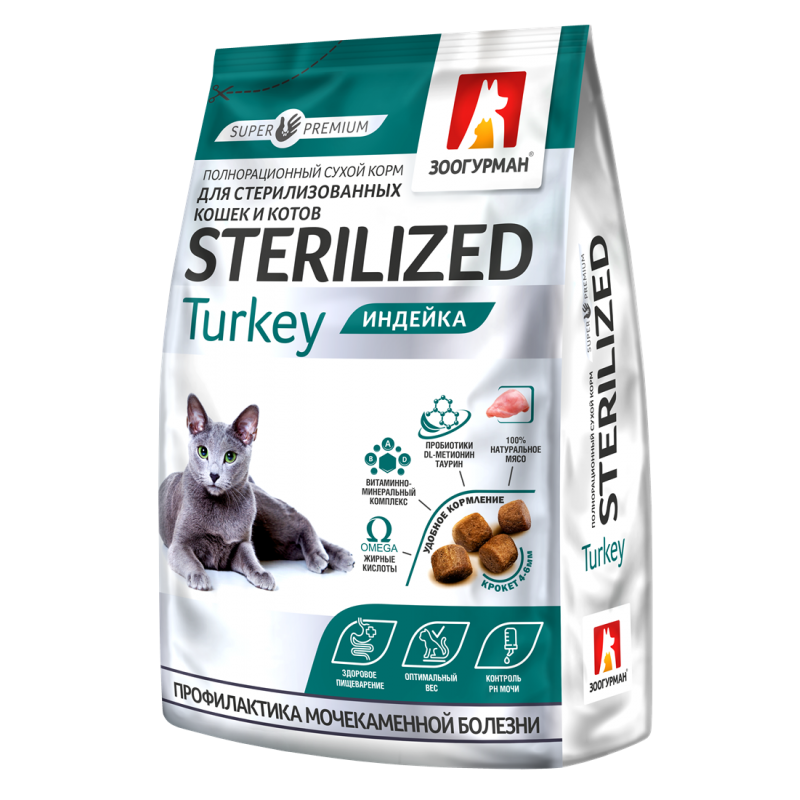 Sterilized Индейка/Turkey – это полнорационный сухой корм для стерилизованных кошек и котов от бренда «Зоогурман».