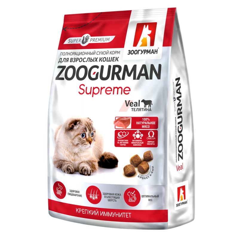 Zoogurman Supreme Телятина/Veal – это полнорационный сухой корм для взрослых кошек от бренда «Зоогурман».