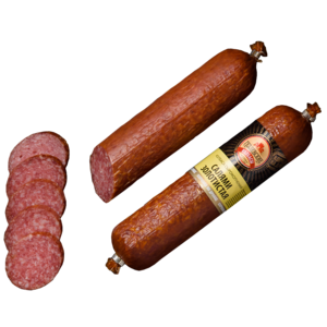 Сырокопченая колбаса Золотистая производится из охлажденного натурального сырья, обладает нежной текстурой и легким ароматом копчения и специй.