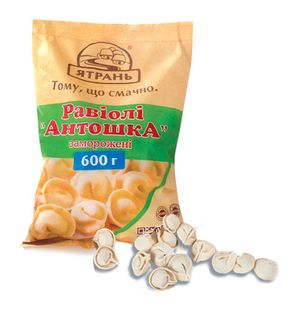 '''Равиоли «Антошка» (Мясокомбинат Ятрань)''' – замороженный рубленый мясной полуфабрикат в тесте. Необходима термическая обработка. | [[Файл:Ravioli antoshka jatran.jpg|мини|Равиоли «Антошка» МК «Ятрань»]] | ||