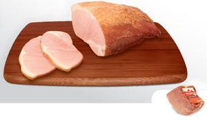 Изготовлена по рецептуре ГОСТ 18255-85. Деликатесный копчено-вареный продукт из свинины, с ароматом черного перца и чеснока.