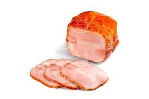 Окорок «Особый» (Поречье) – готовый копчено-вареный мясной продукт из свинины со специями. Оригинальное решение – форма яблока, это самый маленький окорок в списке продукции комбината.1