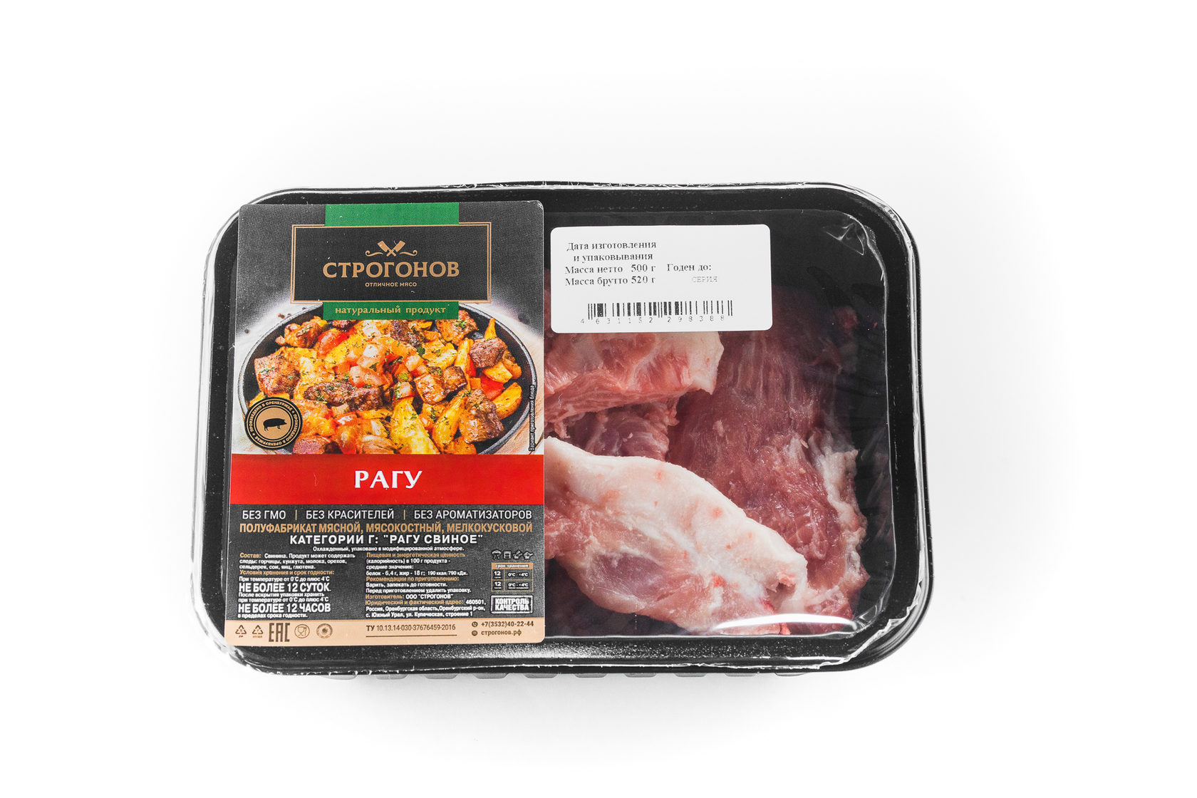 Рагу свиное – это подлежащий дальнейшей термической обработке охлажденный мясной полуфабрикат от производителя «Строгоновъ».