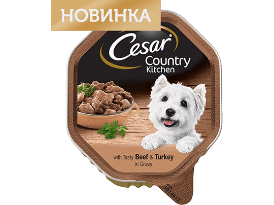 С говядиной и индейкой в соусе – полнорационный консервированный корм для собак от бренда Cesar.
