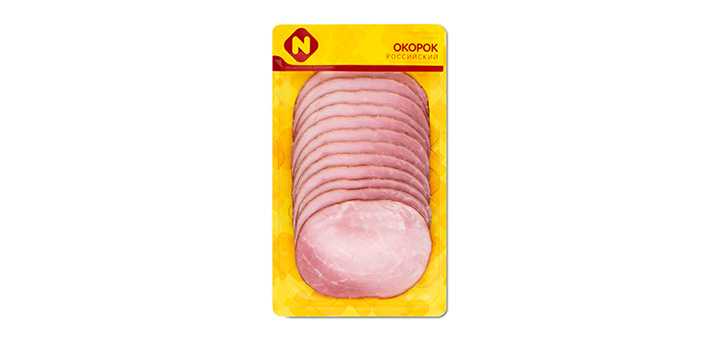 Окорок «Российский» производится из свинины высшего сорта. Технология приготовления окорока – варка и копчение на натуральных буковых опилках – позволяет сохранить нежность, сочность мяса и придает продукту тонкий, нежный вкус1.
